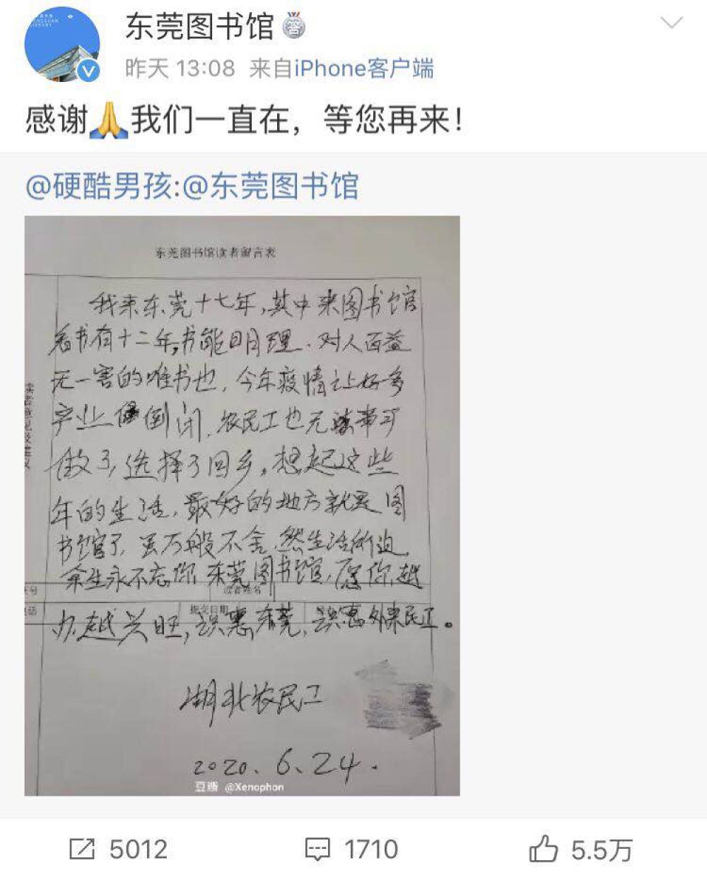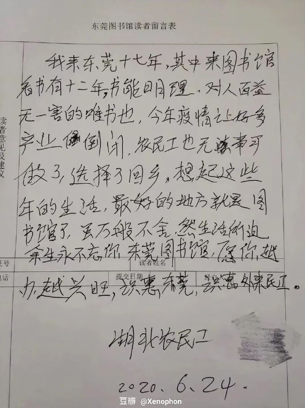 “我來東莞十七年,其中來圖書館看書有十二年。書能明理,對(duì)人百益無一害的唯書也。今年疫情讓好多產(chǎn)業(yè)(企業(yè))倒閉,農(nóng)民工也無事可做了,選擇了回鄉(xiāng)。想起這些年的生活,最好的地方就是圖書館了。雖萬般不舍,然生活所迫,余生永不忘你,東莞圖書館,愿你越辦越興旺。識(shí)惠東莞,識(shí)惠外來農(nóng)民工?!?/span>