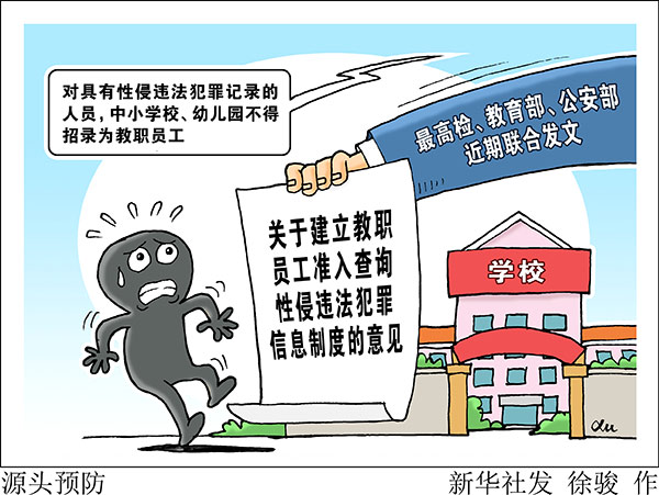 新華社北京9月18日電(記者陳菲)為加強(qiáng)對性侵未成年人犯罪的源頭預(yù)防,最高檢、教育部、公安部近期聯(lián)合發(fā)文,要求在全國建立入職查詢制度,對具有性侵違法犯罪記錄的人員,中小學(xué)校、幼兒園不得錄用,教師認(rèn)定機(jī)構(gòu)不得認(rèn)定教師資格。