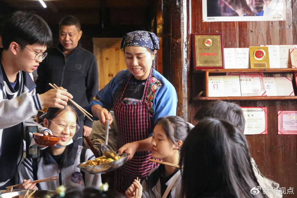 10月26日,十八洞村村民施進(jìn)蘭的妻子龍齊英(中)在農(nóng)家樂給游客們上菜(受訪者供圖) 新華社發(fā)
