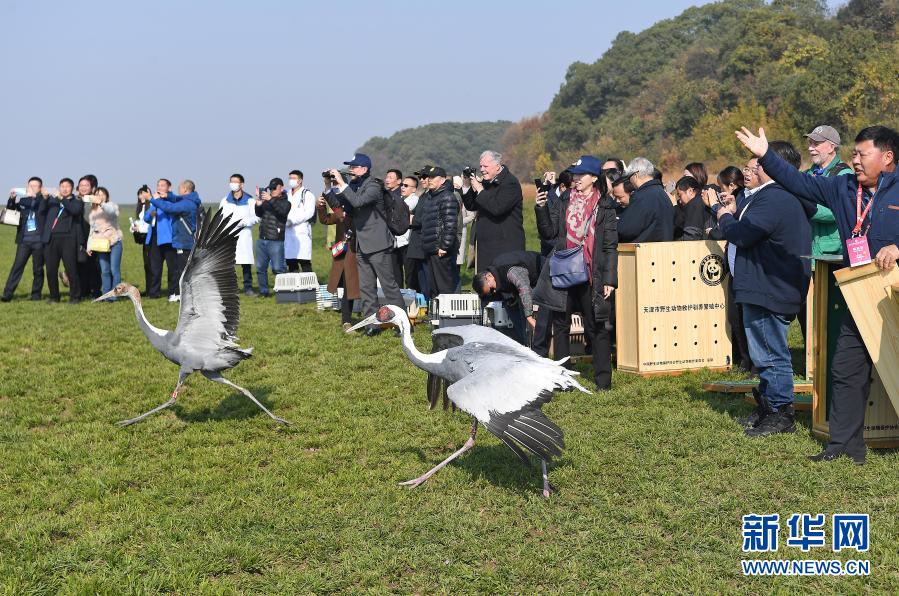 2019年12月8日,國內(nèi)多家野生動物保護機構在江西鄱陽湖國家級自然保護區(qū)將120只被救治的珍稀候鳥成功放飛。這是工作人員放飛兩只白枕鶴。新華社記者 萬象 攝
