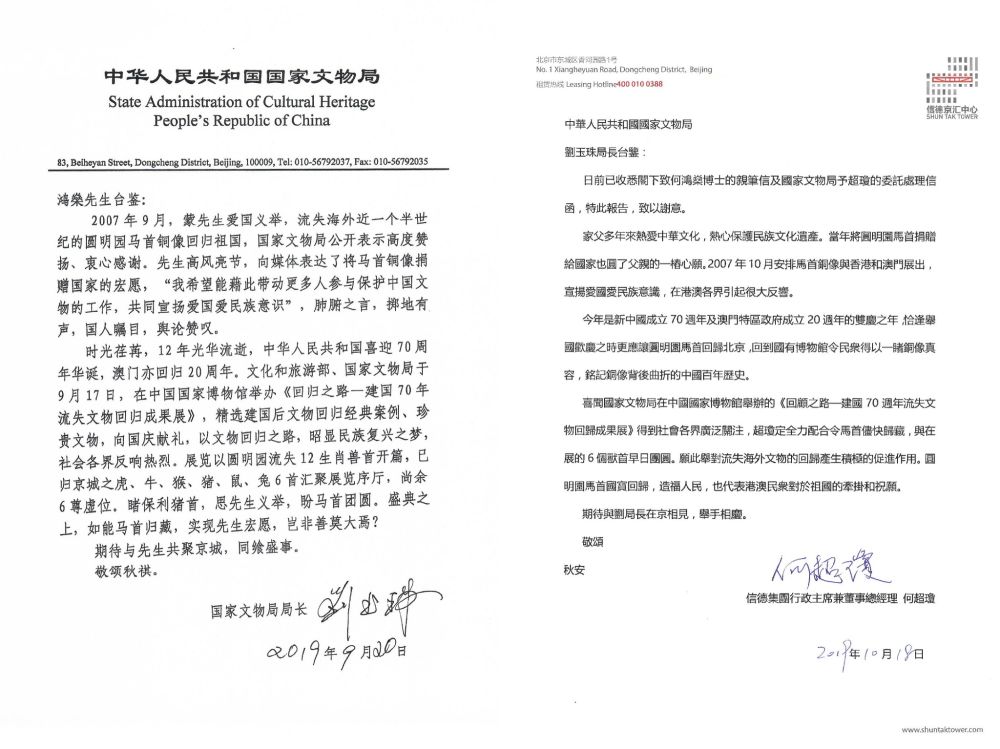 2019年11月,為慶祝中華人民共和國成立70周年和澳門回歸20周年,在國家文物局積極溝通協(xié)調(diào)下,何鴻燊先生決定將圓明園馬首銅像正式捐贈國家文物局。