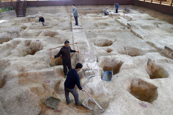 上山考古遺址公園內(nèi)發(fā)掘原址上的考古現(xiàn)場情景再現(xiàn)。韓傳號?攝