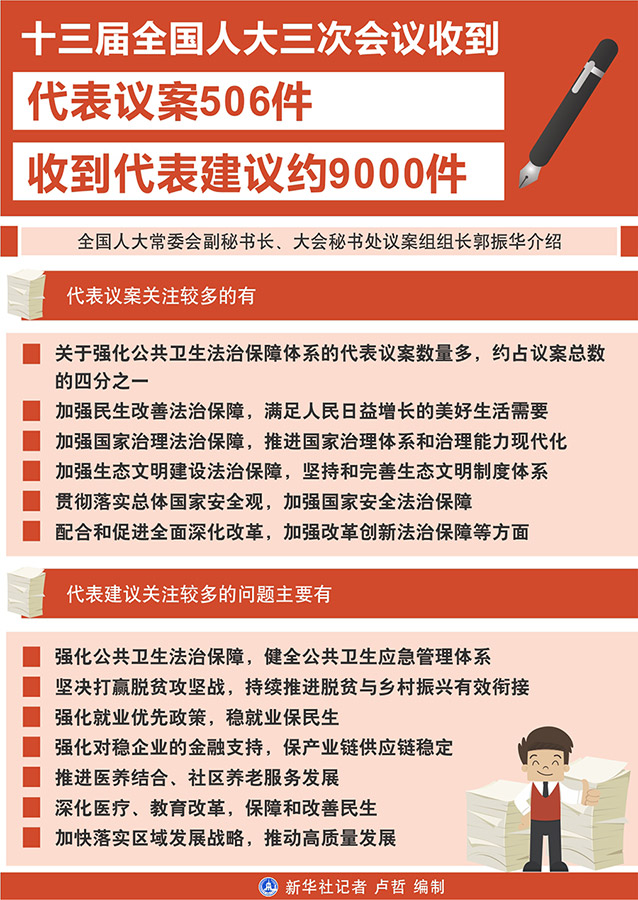 全國(guó)人大常委會(huì)副秘書長(zhǎng)、大會(huì)秘書處議案組組長(zhǎng)郭振華介紹,今年一個(gè)突出特點(diǎn)是關(guān)于強(qiáng)化公共衛(wèi)生法治保障體系的代表議案數(shù)量多,約占議案總數(shù)的四分之一。圍繞加快構(gòu)建疫情防控法律體系,提出修改傳染病防治法、刑法、治安管理處罰法,加大對(duì)瞞報(bào)傳染病、妨礙防疫工作及非法獵殺、銷售、食用野生動(dòng)物等行為的處罰力度,修改中醫(yī)藥法、執(zhí)業(yè)醫(yī)師法、獻(xiàn)血法,以及制定公共衛(wèi)生安全保障等方面的法律。圍繞健全國(guó)家公共衛(wèi)生應(yīng)急管理體系,提出修改突發(fā)事件應(yīng)對(duì)法、價(jià)格法、慈善法,制定社會(huì)救助法以及戰(zhàn)略物資儲(chǔ)備、行政征用、信息公開、社區(qū)應(yīng)急管理、現(xiàn)場(chǎng)救護(hù)等方面的法律。圍繞構(gòu)建國(guó)家生物安全法律法規(guī)體系,提出修改野生動(dòng)物保護(hù)法、動(dòng)物防疫法、食品安全法、漁業(yè)法,制定生物安全法等法律。
