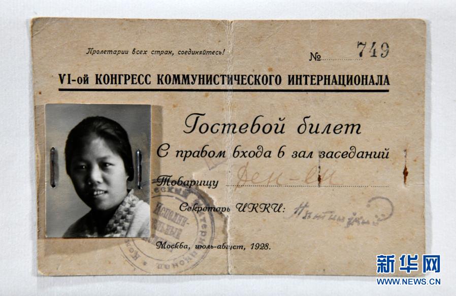 “這是一個長方形的紙質(zhì)證件,俄文印刷的,上面印有‘全世界無產(chǎn)者聯(lián)合起來’‘共產(chǎn)國際第六次代表大會’,用訂書釘固定了一張鄧穎超同志的黑白照片,加蓋有共產(chǎn)國際執(zhí)委會的徽章?!崩钋诮榻B說,這是1928年鄧穎超參加共產(chǎn)國際六大的列席證。此行,鄧穎超還有一個更重要的任務(wù),陪同周恩來參加黨的第六次全國代表大會。
