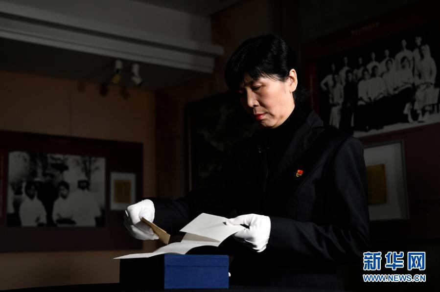 周恩來鄧穎超紀(jì)念館陳列保管部副主任李勤從一個藍(lán)色小箱子中拿出列席證(2020年12月23日攝)。新華社記者 李然 攝