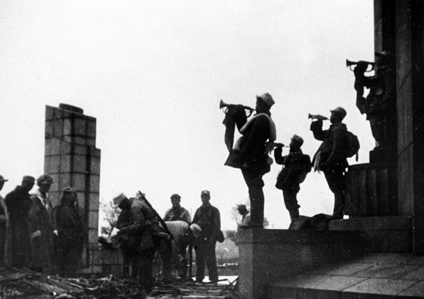遼沈戰(zhàn)役我司號員吹響勝利的號角。 新華社圖片