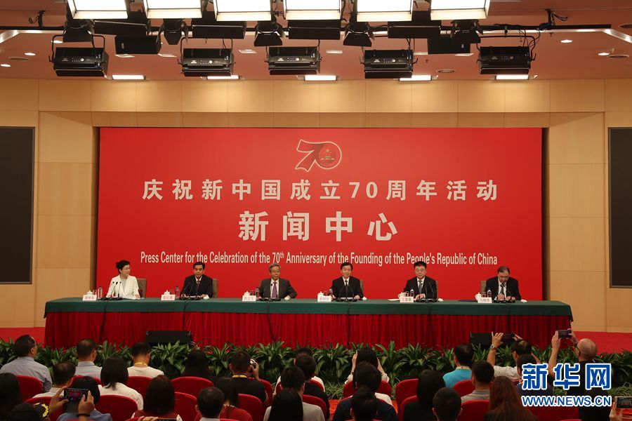 9月26日,慶祝中華人民共和國成立70周年活動新聞中心在北京梅地亞中心二層新聞發(fā)布廳舉辦第二場新聞發(fā)布會。圖為新聞發(fā)布會現(xiàn)場。新華網(wǎng)記者 郭小天 攝