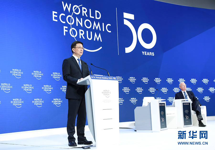 當(dāng)?shù)貢r間1月21日,中共中央政治局常委、國務(wù)院副總理韓正出席達沃斯世界經(jīng)濟論壇2020年年會,發(fā)表題為“共建開放型世界經(jīng)濟 推動全球可持續(xù)發(fā)展”的致辭。 新華社記者 龐興雷 攝