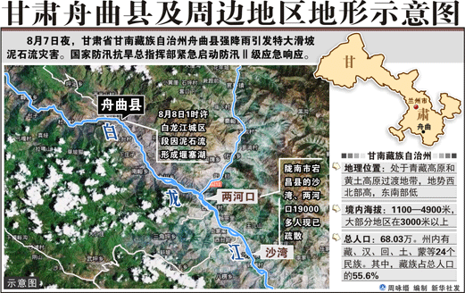 舟曲縣位于甘肅南部,甘南藏族自治州東南部,東鄰武都縣,北接宕昌縣,西南與迭部縣、文縣和四川省九寨溝縣接壤。全縣總面積3010平方公里,轄20個鄉(xiāng)、2個鎮(zhèn),210個行政村,總人口13.47萬人,其中藏族4.4萬人,占32.78%。