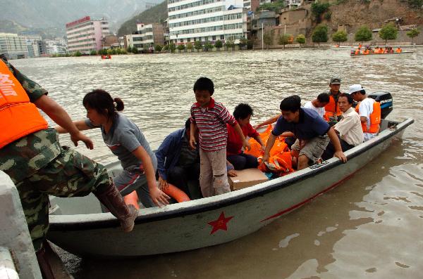 沖鋒舟為舟曲受災群眾開辟水上通道