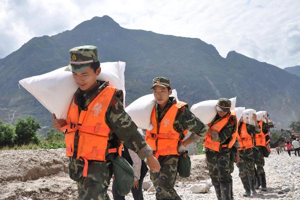武警戰(zhàn)士為舟曲村莊群眾運送物資