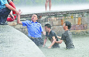 京城學(xué)子西湖冒雨救人 記者巧遇記錄全程