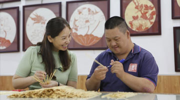 5月24日,在香港会议展览中心,工作人员讲解拍品明代画家仇英的作品《仙山楼阁》。新华社记者 陈铎 摄