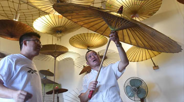 6月1日,在广西宾阳县宾州镇陆村,陆云岗在制作油纸伞。