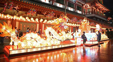 1月21日,游客在豫园商城黄金广场赏灯。