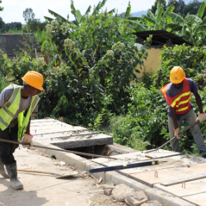 1月21日,在卢旺达北方省布雷拉地区,两名当地工人在由中国路桥和卢本土企业组成的联营体承建的道路升级项目上进行盖板铺装。