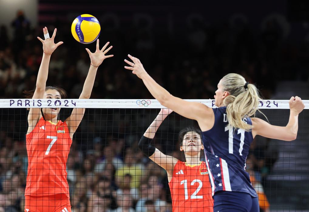 2024年7月29日,中国队球员王媛媛(左)和李盈莹(中)在比赛中防守。当日,在巴黎奥运会排球女子小组赛A组比赛中,中国队3比2战胜美国队。新华社记者 李钢 摄