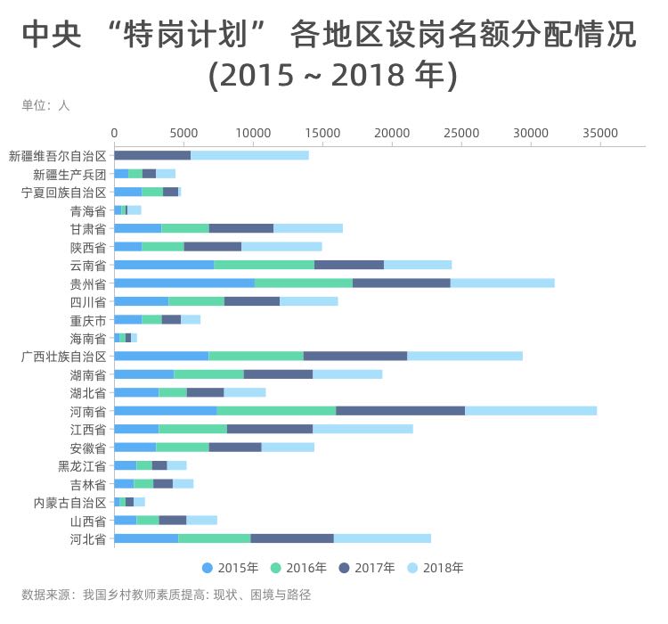 ????? 從目前鄉(xiāng)村教師的培養(yǎng)和補(bǔ)充來(lái)看, 我國(guó)采取了多渠道補(bǔ)充模式。為加強(qiáng)鄉(xiāng)村教師的培養(yǎng)和補(bǔ)充。各地在不斷完善統(tǒng)一公開(kāi)的招考制度的基礎(chǔ)上, 結(jié)合“ 三支一扶”“ 特崗計(jì)劃”“公費(fèi)師范生”“ 碩師計(jì)劃”“全科教師”等專(zhuān)項(xiàng)計(jì)劃,在短時(shí)間內(nèi)培養(yǎng)了大批教育碩士、免費(fèi)師范生等優(yōu)秀師資,有效地補(bǔ)充了鄉(xiāng)村中小學(xué)師資隊(duì)伍。教育部公布的數(shù)據(jù)顯示,2018年全國(guó)計(jì)劃招聘“特崗計(jì)劃”教師9萬(wàn)人,其中河南0.95萬(wàn)人、廣西0.83萬(wàn)人、貴州0.75 萬(wàn)人、江西0.72萬(wàn)人。