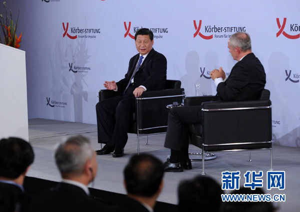??? 這是演講結(jié)束后習近平主席回答科爾伯基金會常務副主席魏邁爾的提問。新華社記者 饒愛民 攝
