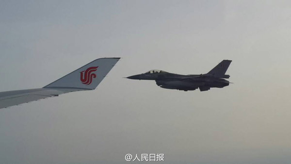 ????當(dāng)習(xí)近平乘坐的專(zhuān)機(jī)進(jìn)入比利時(shí)領(lǐng)空時(shí),比利時(shí)皇家空軍兩架戰(zhàn)機(jī)升空護(hù)航。(圖片來(lái)源:《人民日?qǐng)?bào)》法人微博)