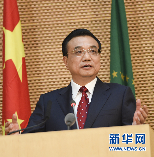 ??? 5月5日,國務(wù)院總理李克強(qiáng)在位于亞的斯亞貝巴的非洲聯(lián)盟總部發(fā)表題為《開創(chuàng)中非合作更加美好的未來》的演講。 新華社記者 李學(xué)仁 攝
