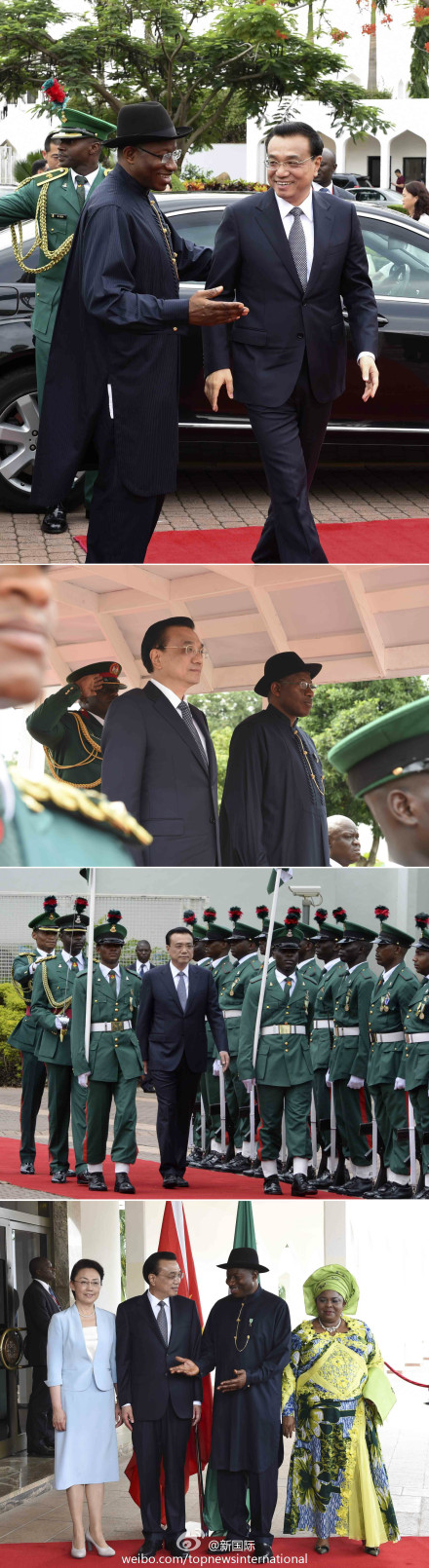 ??? 新華網(wǎng)北京5月7日電? 據(jù)新華社“新國際”微博報(bào)道,當(dāng)?shù)貢r(shí)間7日上午,尼日利亞總統(tǒng)喬納森在總統(tǒng)府為李克強(qiáng)總理舉行隆重歡迎儀式,現(xiàn)場鳴響禮炮,軍樂隊(duì)奏兩國國歌,李克強(qiáng)檢閱了儀仗隊(duì)。