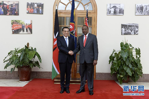 ????肯雅塔代表肯尼亞政府和人民熱烈歡迎李克強(qiáng)訪肯,表示在周恩來(lái)總理訪非50周年之際,李克強(qiáng)總理對(duì)非洲進(jìn)行的里程碑式訪問(wèn)取得圓滿成功,將進(jìn)一步深化非中新型戰(zhàn)略伙伴關(guān)系??现杏兄嗤臍v史遭遇和發(fā)展任務(wù),肯方感謝中方對(duì)肯經(jīng)濟(jì)社會(huì)發(fā)展和保護(hù)生態(tài)環(huán)境、野生動(dòng)物資源的幫助和支持,高度贊賞中國(guó)為維護(hù)非洲和平與發(fā)展作出的重要貢獻(xiàn),完全贊同李克強(qiáng)總理在非盟演講中提出的“461”非中合作框架和在世界經(jīng)濟(jì)論壇非洲峰會(huì)特別致辭中提出的合作建設(shè)非洲基礎(chǔ)設(shè)施“三大網(wǎng)絡(luò)”的主張,愿與中方加強(qiáng)戰(zhàn)略溝通,全面推進(jìn)各領(lǐng)域合作,實(shí)現(xiàn)共同發(fā)展??戏皆缸鲋袊?guó)企業(yè)進(jìn)入非洲的門(mén)戶(hù),為推動(dòng)非中合作發(fā)揮積極作用。