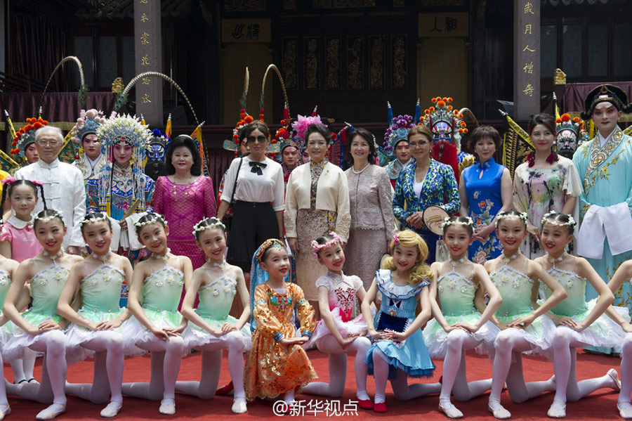 ????彭麗媛和貴賓們到上海豫園,參觀金山農(nóng)民畫(huà)、面塑、顧繡、木版水印、扎染等展示,欣賞少兒歌舞《茉莉花》、昆曲《牡丹亭》選段、滬劇與二胡《燕燕做媒》、太極·古琴《高山流水》、京劇選段《梨花頌》等演出。