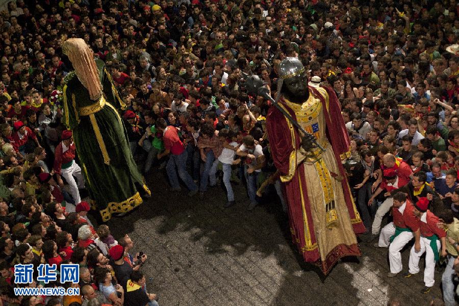 西班牙貝爾加(Berga)市的La Patum節(jié)上,巨大的人偶穿過(guò)狂歡的人群。