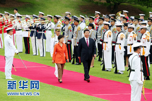 ??? 7月3日,國(guó)家主席習(xí)近平在首爾同韓國(guó)總統(tǒng)樸槿惠舉行會(huì)談。會(huì)談前,樸槿惠在青瓦臺(tái)總統(tǒng)府為習(xí)近平舉行隆重歡迎儀式。 新華社記者姚大偉攝