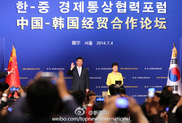 新華網(wǎng)北京7月4日電 據(jù)新華社“新國際”微博報道,習近平表示,中韓應共同反對保護主義,兩國企業(yè)可以在制定國際標準、開拓國際市場、參與區(qū)域一體化進程等方面加強探討、拓展合作。中方歡迎韓國參與亞洲基礎(chǔ)設(shè)施投資銀行籌建,共同推動地區(qū)互聯(lián)互通和基礎(chǔ)設(shè)施建設(shè)。