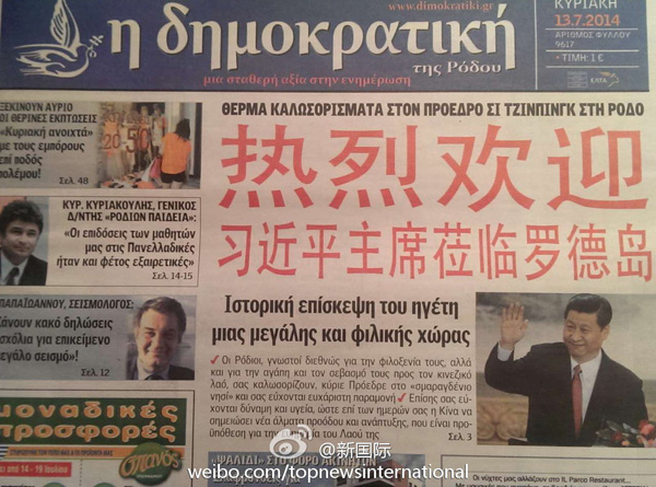 ????新華網北京7月14日電 據新華社“新國際”微博報道,希臘羅德島報紙《民主報》13日在頭版發(fā)表題為《一個偉大友好國家領導人的歷史性訪問》文章,并用中文紅色大字體寫著“熱烈歡迎習近平主席蒞臨羅德島”。文章說,熱情好客的羅德島人民祝愿習近平主席身體健康,祝愿中國在習主席領導下取得跨越式發(fā)展,祝愿中國繁榮昌盛。