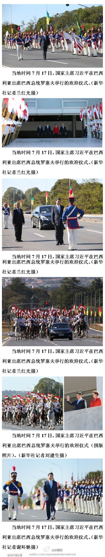 ????新華網(wǎng)北京7月18日電 據(jù)新華社“新國際”微博報(bào)道,17日,巴西總統(tǒng)羅塞夫?yàn)榱?xí)近平舉行隆重歡迎儀式。在總統(tǒng)府入口處,習(xí)近平與羅塞夫親切握手、問候。軍樂團(tuán)奏中巴國歌,升中國國旗,鳴禮炮21響。隨后,兩位元首一同登上觀禮臺(tái),觀看儀仗隊(duì)分列式。騎兵馬隊(duì)簇?fù)碇娖?,奔騰跳躍,奮蹄疾馳。?