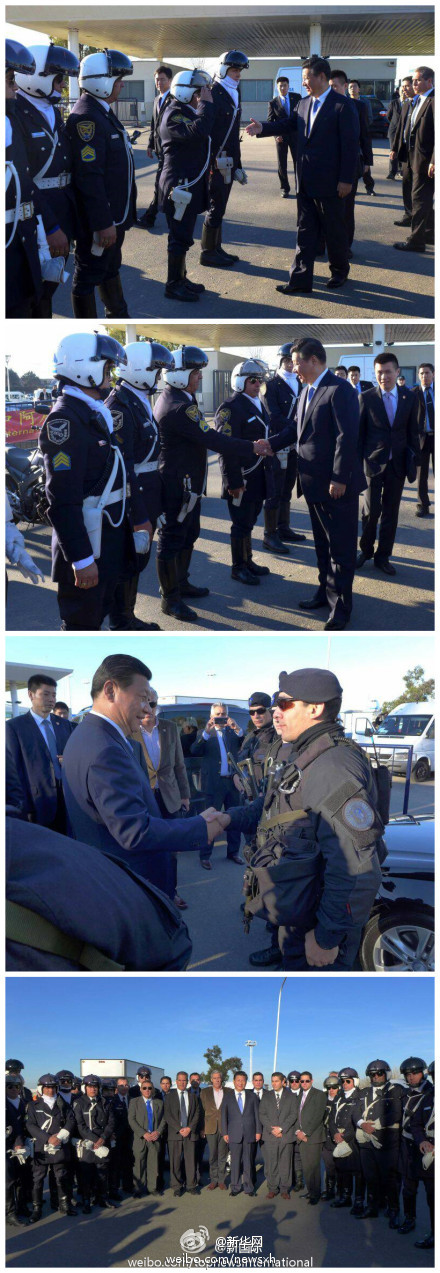 ????新華網(wǎng)北京7月21日電 據(jù)新華社“新國(guó)際”微博報(bào)道,43小時(shí)的阿根廷之旅,佩戴頭盔、全副武裝的騎警們一路護(hù)衛(wèi),十分辛苦。20日上午,訪問(wèn)即將結(jié)束,車隊(duì)來(lái)到埃塞伊薩國(guó)際機(jī)場(chǎng)外,得知騎警們按規(guī)定不進(jìn)機(jī)場(chǎng),習(xí)近平臨時(shí)要求停車,來(lái)到騎警們面前,同他們一一握手道別表示感謝,并合影。?