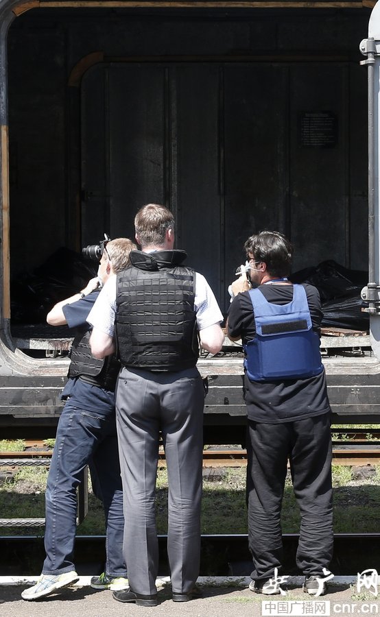 當(dāng)?shù)貢r間2014年7月20日,烏克蘭頓涅茨克Torez,馬航墜機(jī)遇難乘客遺體被裝上列車?yán)洳剀噹麑⒈贿\走。載有部分遺體的火車從距空難現(xiàn)場不遠(yuǎn)的烏克蘭托列茲市出發(fā),前往頓涅茨克市?;疖囯x站前,身處空難現(xiàn)場的歐洲安全與合作組織(歐安組織)代表檢查了運載遺體的5節(jié)冷藏車廂。