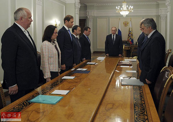 7月17日夜,在俄羅斯莫斯科州新奧加廖沃官邸,俄羅斯總統(tǒng)普京(后)和一些高級別官員在經濟問題會議前為墜毀馬航MH17航班的遇難者默哀。普京當晚說,馬航客機失事悲劇發(fā)生在烏克蘭領空,烏克蘭無疑對此承擔責任。