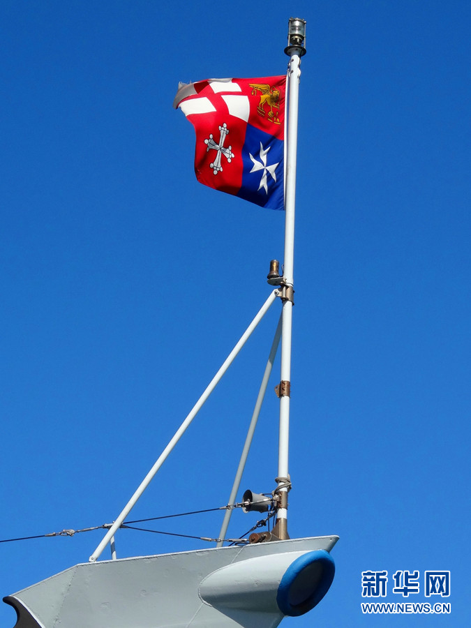 ????意大利海軍軍旗。帶領(lǐng)記者參觀的工作人員說,軍旗上的四塊標志代表了意大利的四個不同城市。新華網(wǎng)記者 周喆 攝