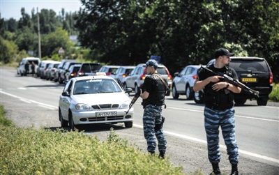 7月28日,來(lái)自澳大利亞和荷蘭的調(diào)查人員前往墜機(jī)現(xiàn)場(chǎng)途中,烏克蘭民間組織在其車(chē)隊(duì)后面封鎖道路。