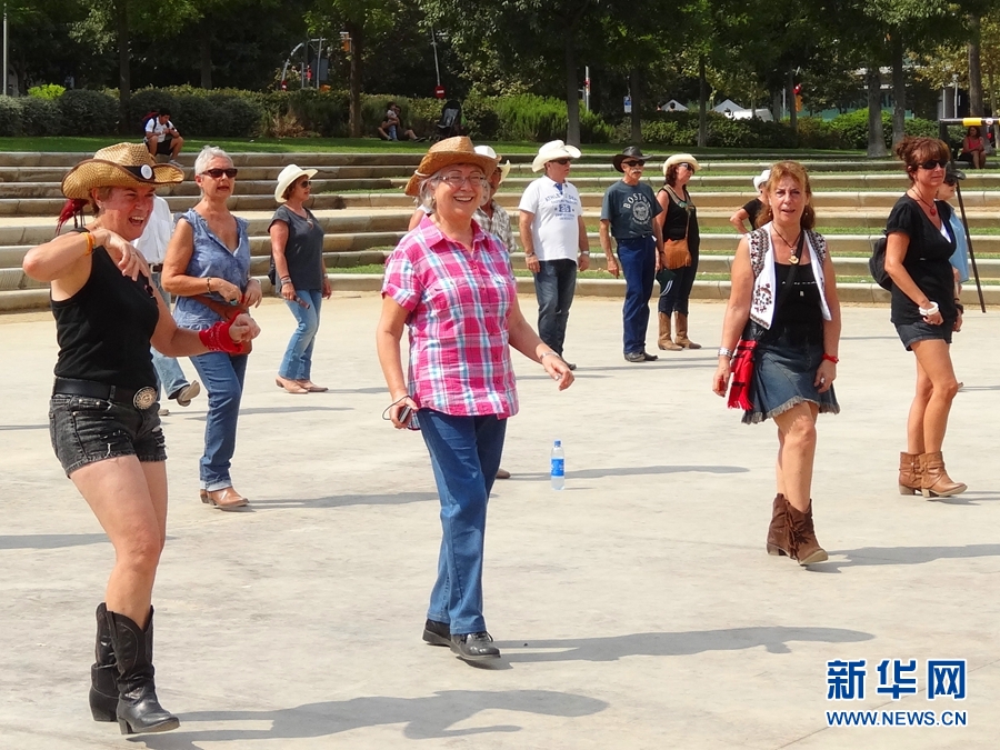 ??? 9月14日,一個(gè)陽(yáng)光燦爛天氣晴朗的禮拜天上午,在西班牙巴塞羅那一處居民區(qū)的空地上,一群大叔大媽們歡快地組團(tuán)跳舞。頭戴牛仔帽、身穿T恤仔褲、腳踏長(zhǎng)筒靴,大叔大媽們顯得格外“有范兒”。