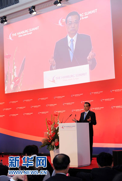 ??? 當?shù)貢r間10月11日中午,國務院總理李克強在漢堡出席中歐論壇漢堡峰會第六屆會議并發(fā)表題為《樹立互利共贏的新標桿》的主旨演講。新華社記者 饒愛民 攝