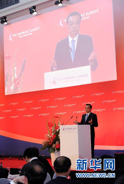 ??? 當地時間10月11日中午,國務院總理李克強在漢堡出席中歐論壇漢堡峰會第六屆會議并發(fā)表題為《樹立互利共贏的新標桿》的主旨演講。新華社記者 饒愛民 攝