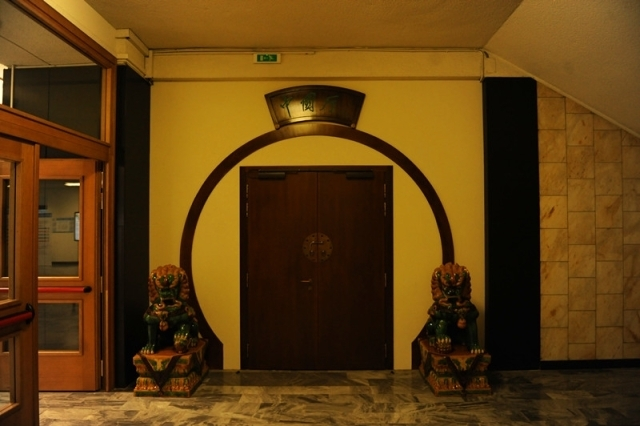 ????中國廳的大門采用了中式古典園林常見的月亮形拱門,旁邊蹲著兩尊唐三彩的小獅子。屋里的宮燈、瓷瓶、雕塑、堆繡的《清明上河圖》,無不透著濃濃的中國韻味。正對(duì)廳門的墻壁上還掛有一幅中國地圖。