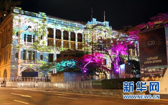 ????這是11月15日在澳大利亞布里斯班拍攝的夜景。當(dāng)日,二十國集團領(lǐng)導(dǎo)人第九次峰會在澳大利亞布里斯班舉行。入夜,布里斯班街頭部分建筑披上了彩色的“外衣”。 新華社記者 趙丹惠 攝