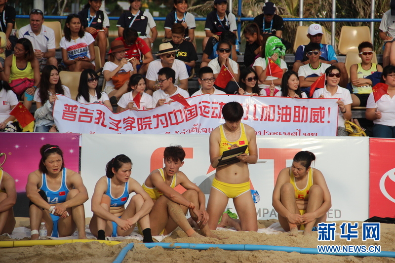 ??? 11月16日,中國沙灘手球運(yùn)動員們比賽中場休息。中國體育代表團(tuán)16日在泰國普吉舉行的第四屆亞洲沙灘運(yùn)動會上勇奪2枚金牌和2枚銅牌。當(dāng)天比賽全部結(jié)束時(shí),中國隊(duì)以3金2銀5銅的成績暫列獎牌榜第五。新華社發(fā)(塔納攝)