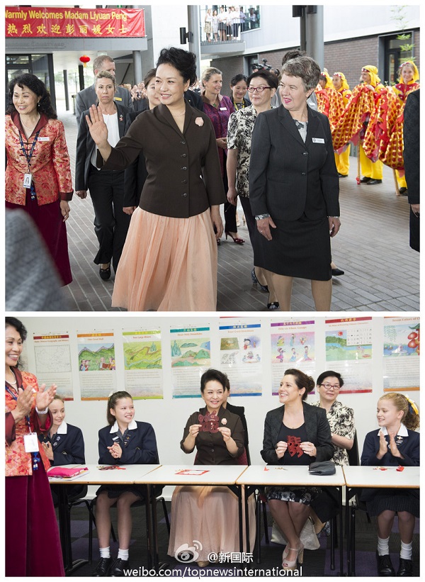 ??? 新華網(wǎng)北京11月19日電 據(jù)新華社“新國(guó)際”微博報(bào)道,習(xí)近平主席夫人彭麗媛19日在悉尼參觀育文武女子學(xué)校,在舞龍隊(duì)引導(dǎo)下來(lái)到孔子課堂?!鞍兹找郎奖M……”16名女孩朗誦《登鸛雀樓》,還學(xué)打中國(guó)結(jié)、制作剪紙、繡織漢字“中澳友誼長(zhǎng)存”。彭麗媛拿起剪刀,剪出一個(gè)“福”字。?