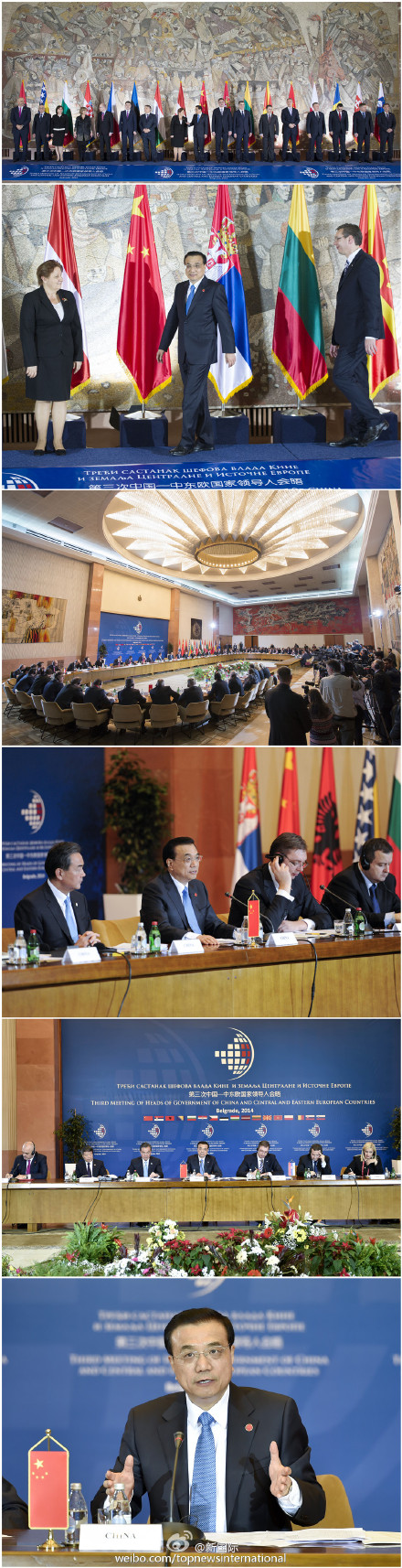 ??? 新華網(wǎng)北京12月17日電 據(jù)新華社“新國(guó)際”微博報(bào)道,當(dāng)?shù)貢r(shí)間16日下午,李克強(qiáng)總理在貝爾格萊德出席第三次中國(guó)-中東歐國(guó)家領(lǐng)導(dǎo)人會(huì)晤。中東歐16國(guó)領(lǐng)導(dǎo)人與會(huì)。李克強(qiáng)與塞爾維亞總理武契奇共同主持會(huì)晤,并就推進(jìn)中國(guó)與中東歐合作提出五點(diǎn)建議,與會(huì)各方深入討論,達(dá)成了深化合作的廣泛共識(shí)。