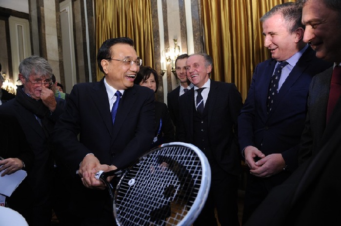李克強(qiáng)與電影《瓦爾特保衛(wèi)薩拉熱窩》中“吉斯”的扮演者“對暗號”。中新社 劉震 攝