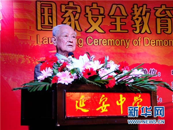 ????5月12日,中國政策科學(xué)研究會(huì)國家安全政策委員會(huì)副會(huì)長、軍事科學(xué)院原副院長糜振玉,在延安中學(xué)“國家安全教育示范基地”啟動(dòng)儀式上致辭。(新華網(wǎng)記者 郝斐然 攝)