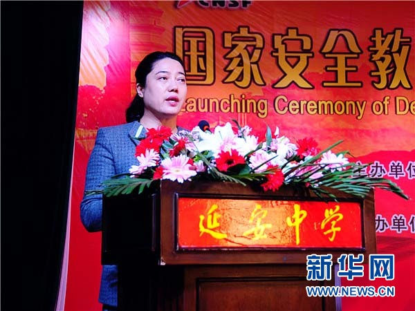 ????延安市副市長趙璟在延安中學(xué)“國家安全教育示范基地”啟動(dòng)儀式上致辭。(新華網(wǎng)記者 郝斐然 攝)
