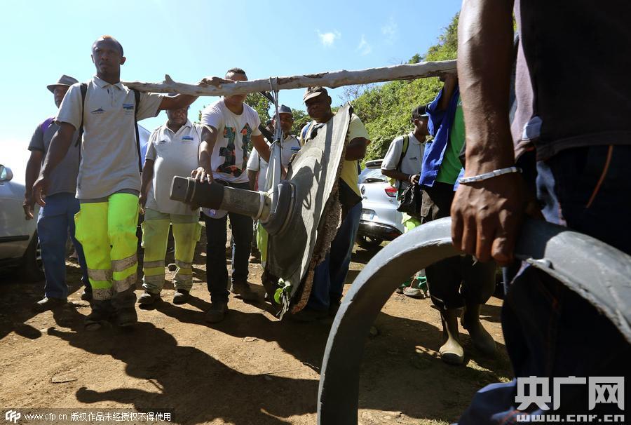 當(dāng)?shù)貢r間2015年8月11日,法屬留尼汪島,當(dāng)?shù)厮丫汝牜@得的馬航MH370殘骸。